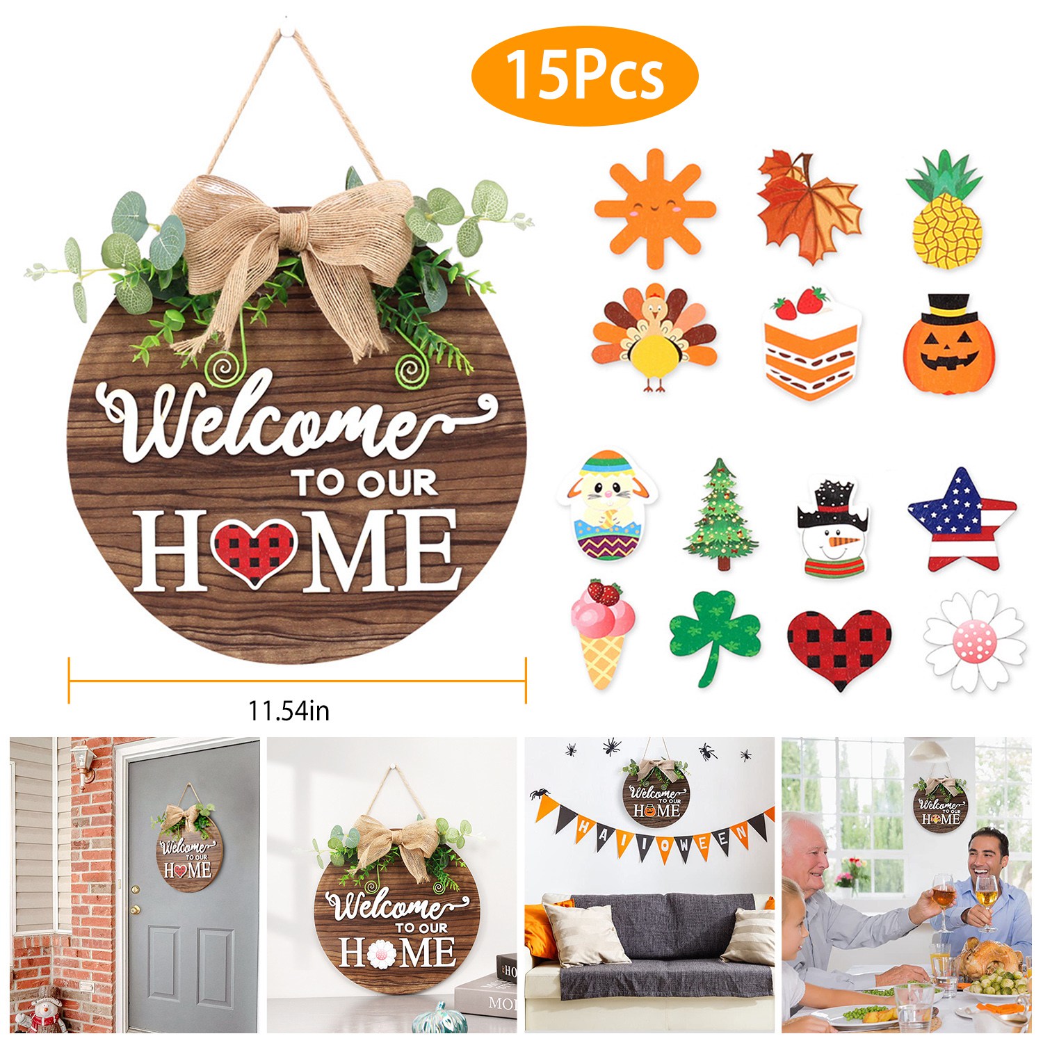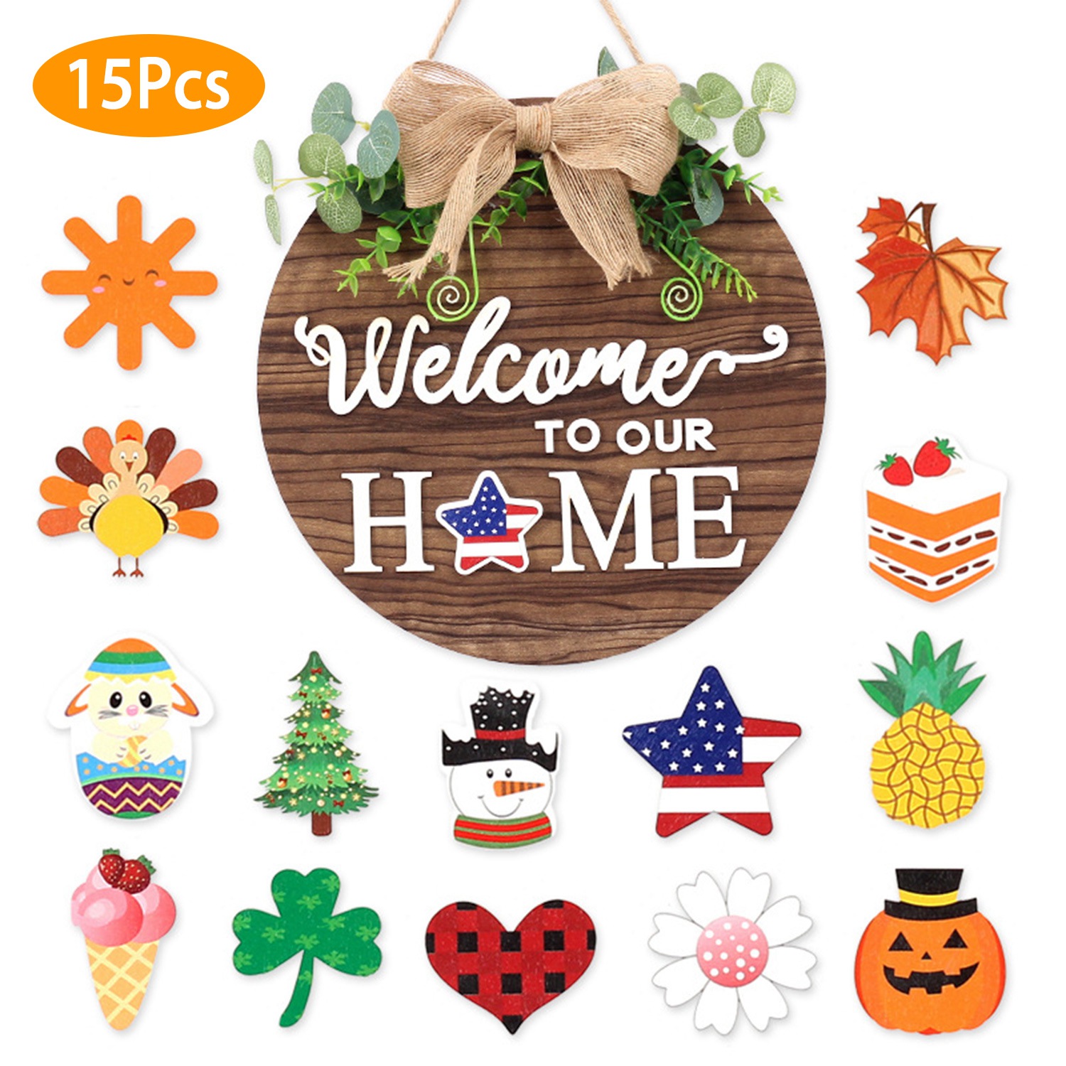 Interchangeable Welcome Sign Seasonal Wood Wall Hanging Front Door Decor with 14 Interchangeable Seasonal Icons for Halloween Christmas Thanksgiving D